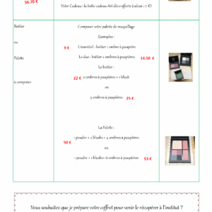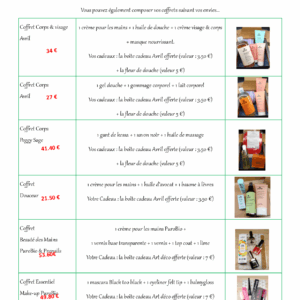 Retrouvez également des idées de coffrets cadeaux à l’institut. Vous pouvez opter pour un coffret tout prêt ou le composer vous même. Je vous offre à cette occasion la boîte du coffret* et une fleur de douche*